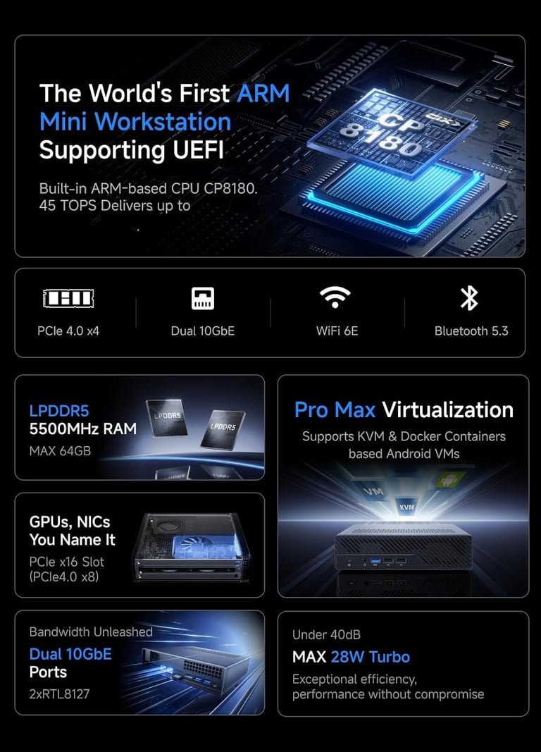 Processor (SoC): CIX CP8180 (ARMv9.2-A) with 12 cores and 12 threads (8 performance, 4 efficiency), 2.6 GHz base clock, and 28W TDP.